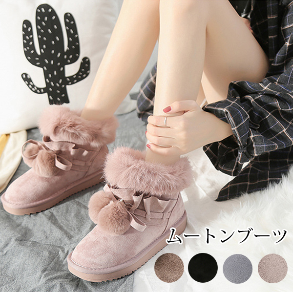 ムートンブーツ レディース ショートブーツ ポンポン付き ラウンドトゥ ファームートン 靴 ファー アンクル 防寒 冬物 フラットヒール