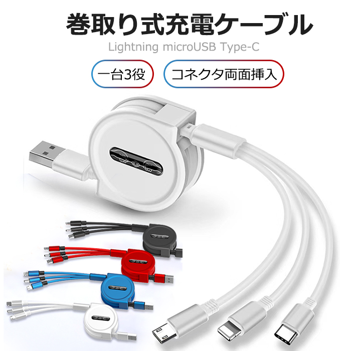 どこでも一本で3役 スマホケーブル アイフォン 充電 巻取り 断線防止 耐久性 全機種対応 収納便利 長さ調整可能 タイプ ケーブル
