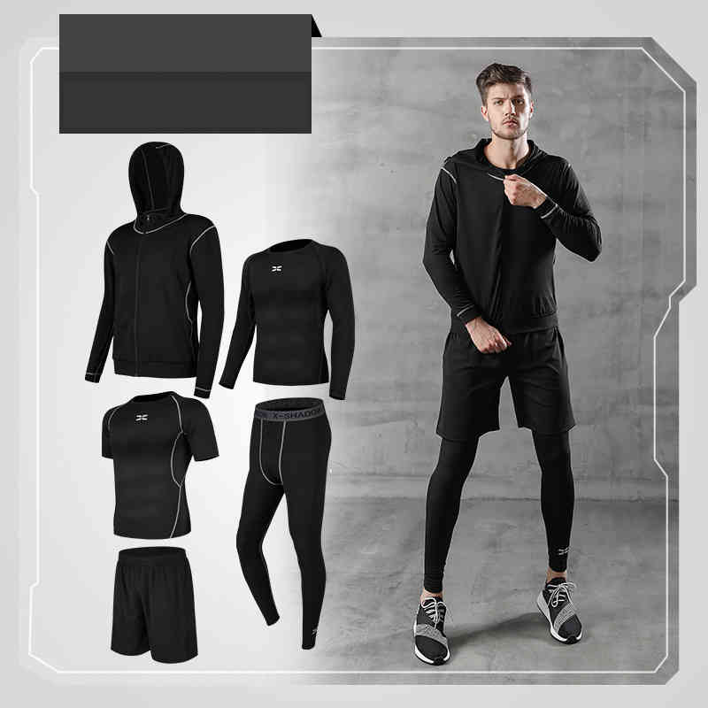 メンズ コンプレッションウェア 5点セット 長袖 半袖 ハーフパンツ レギンス パーカー 通気性 速乾性 伸縮性 ジャージ上下トレーニングウェア 夏用