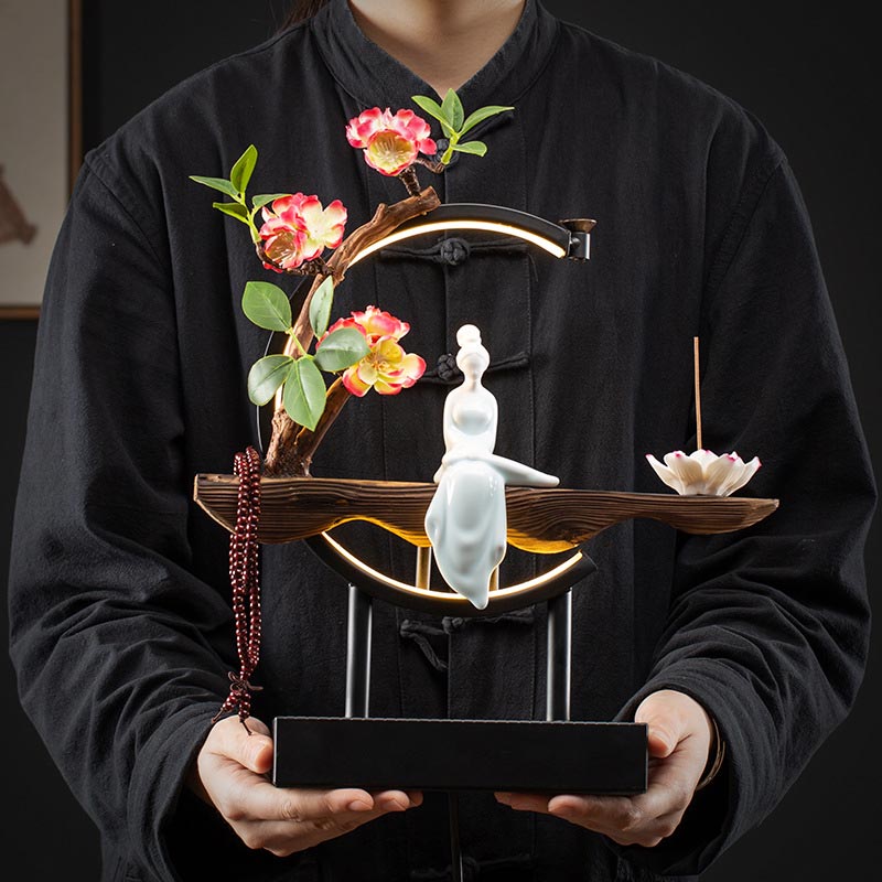 お香立て 置物 線香立て 木製 花 座る 数珠 ライト 幻想 風水 風流 インテリア 置物 香り 玄関 自宅 自粛 ヒーリング アジアン 仏具 祈り 癒し 部屋 開運 グリーン 神秘 モダン