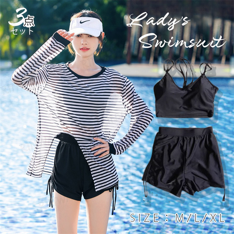 スポーツウェア 3点セット スレンダーライン ビーチウェア タイト スタイリッシュ 海水浴 水泳 水中ウォーキング スイムウェア 着痩せ 速乾 紫外線カット uvカット フィットネス水着