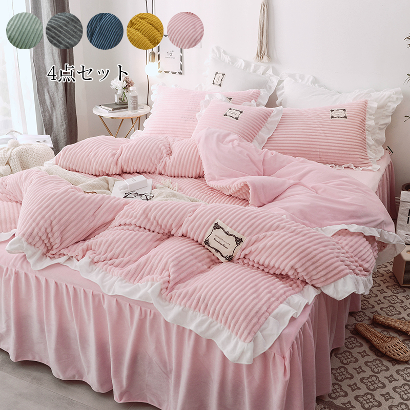 布団カバー セット柔らか 優しい 肌触り 寝具 掛布団 おしゃれ まくら 丸洗い 吸汗 速乾 4点セット シーツ ベット フリル付き 可愛い おしゃれ