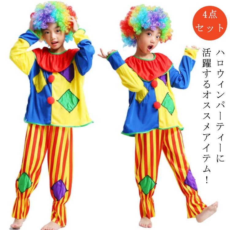 キャラクター 子供用コスチューム ハロウィン 女の子 男の子 衣装 4点セット ピエロ衣装 キッズ 子供用 子供 ハロウィン コスチューム コスプレ 子供 文化祭 演劇 着ぐるみ イベント 道化師 舞