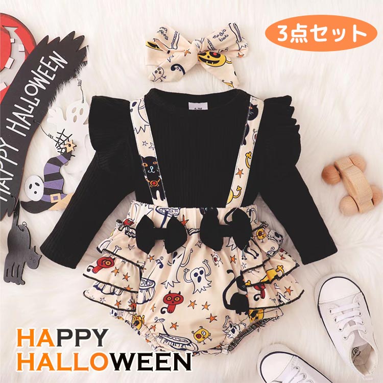 ロンパース トップス ヘアバンド 3点セット ハロウィン衣装 ベビー用 長袖 ロンパース 女の子 66 73 80 90cm