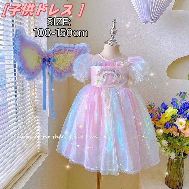 可愛い虹色 翼 子供ドレス ジュニア フォーマルドレス パーティードレス ピンク 110 120 130 140 150 チュールワンピース コスプレ衣装 なりきり パーティー イベント用 演出服