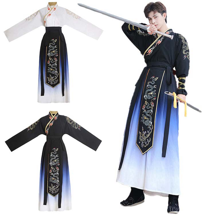 ハロウィン メンズ チャイナ服 漢服 中華服 グラデーション 華流 コスプレ衣装 男性用 長袖 上下セット 3点セット 龍デザイン 刺繍 カンフー衣装 マント 大人 華流