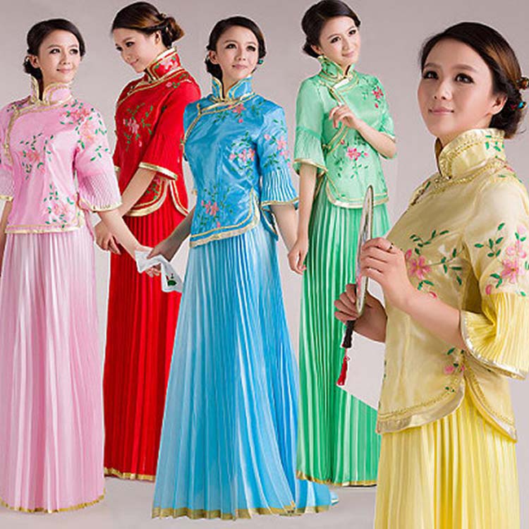 チャイナカラートップス ダンス 中国風ブライドメイドドレス チャイナ服 華流コスプレ衣装 チャイナドレス 大人用 可愛い漢服唐装 中国民族風舞台ステージ衣装 ロングスカート 衣装