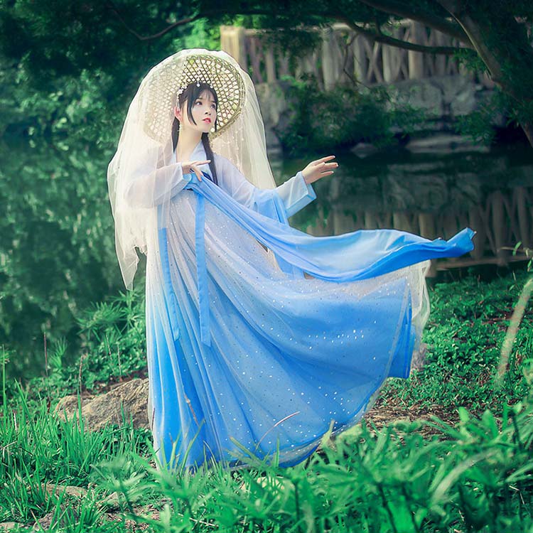 中華服 華流コスプレ衣装 チャイナ風舞台ステージ衣装 大き裾古典ダンス衣装 配色 スパンコールキラキラ漢服唐装 ショール付 ブルーコスプレ衣装 中国古代宮廷衣装 お姫様貴妃衣装