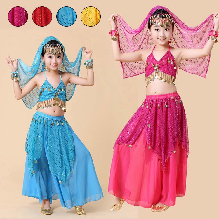 4点セットアップ 舞台衣装 豪華コスプレ衣装 ラテンダンス アラジン スパンコール キッズ コスチューム インド風 子供ベリーダンス衣装