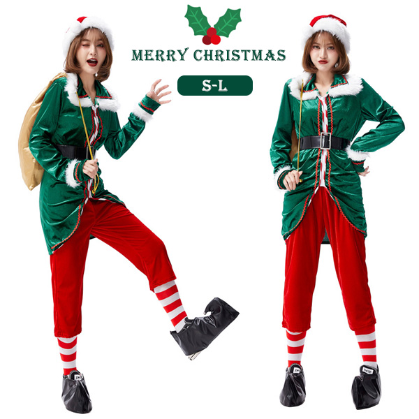 帽子+トップス+パンツ+ベルト+靴カバー+ソックスの6点セット サンタ コスプレ衣装 レディース サンタクロース