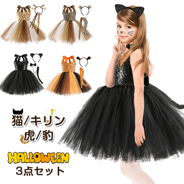 キッズ 子供服 ハロウィン コスプレ 虎 トラ ヒョウ 豹 猫 黒猫 スカート着ぐるみホビー コスプレ 変装 仮装 コスチューム一式