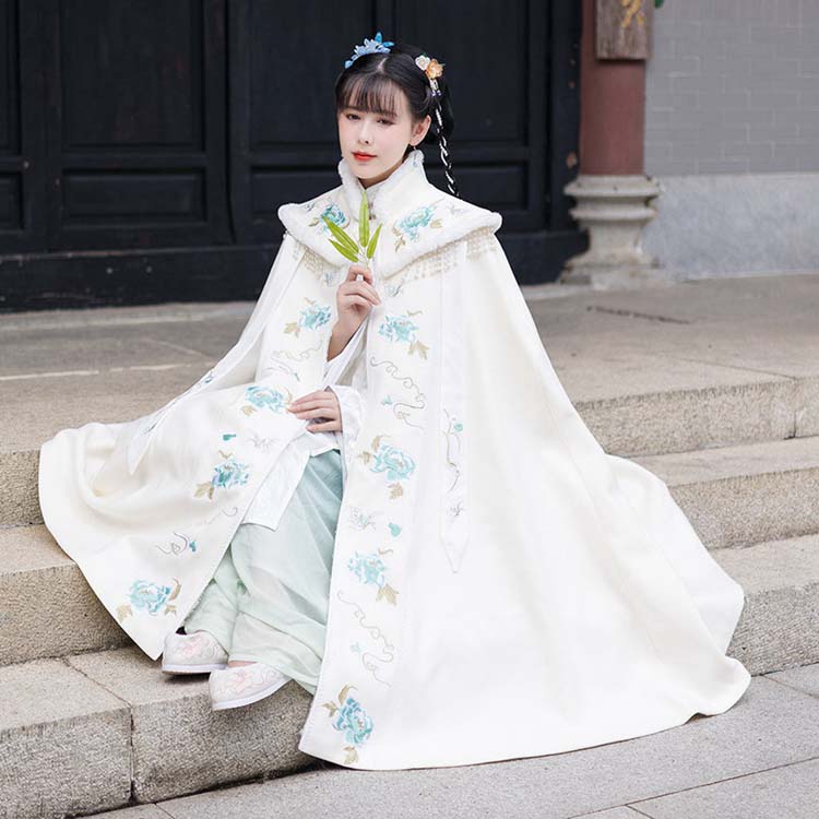 マント羽織 レディース 中華服 マント ロング丈 ミモレ丈 冬向き 漢服 唐装 かわいい チャイナ服 中華 コスプレ 衣装 華流 青花 刺繍 エスニック パール フリンジ 飾り