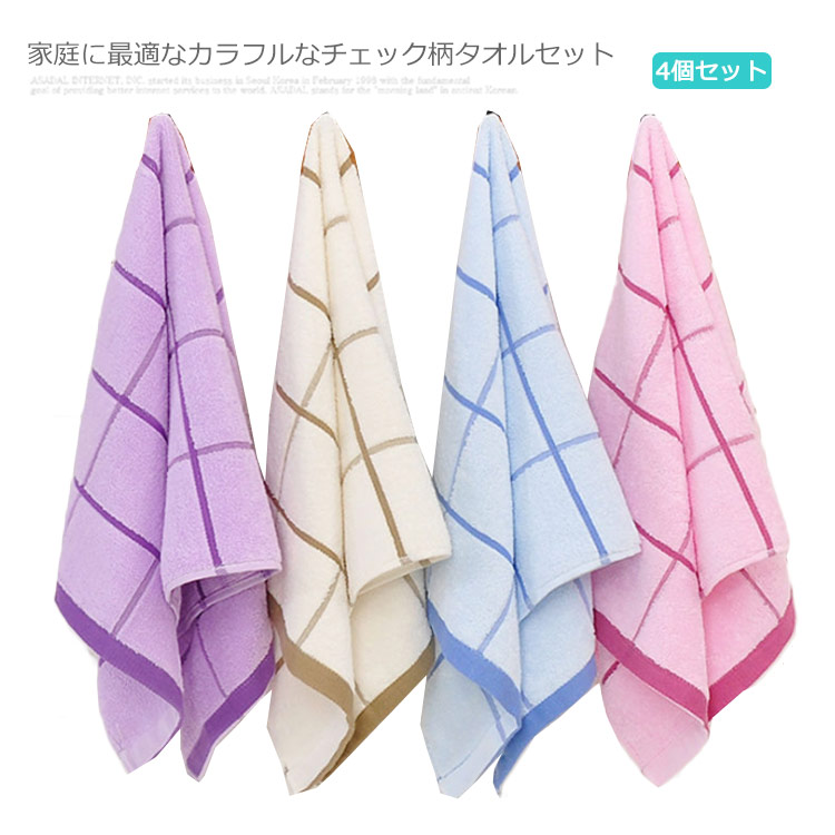 4枚セット チェック タオル 柔らかい 高品質 吸水 速乾 通気 快適 シャワー用 フェイスタオル プール用 家庭用 業務用