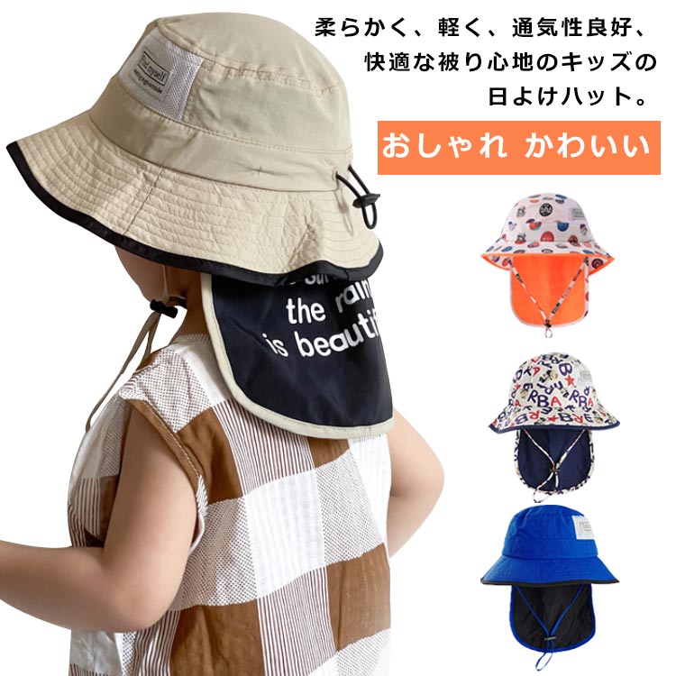 ベビー 日よけ 女の子 46-49 キッズ たれ付き つば広 カット サファリハット 帽子 タレ付き アウトドア 男女兼用 紐 ハット キャップ あご紐 お出かけ 配色 男の子 50+