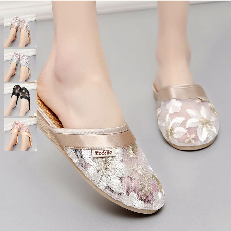 スリッパサンダル 綿麻 レディース レース ルームシューズ 軽量 消音 防臭 室内用 来客用 透かし編み 夏用 蒸れない メッシュ フラットサンダル