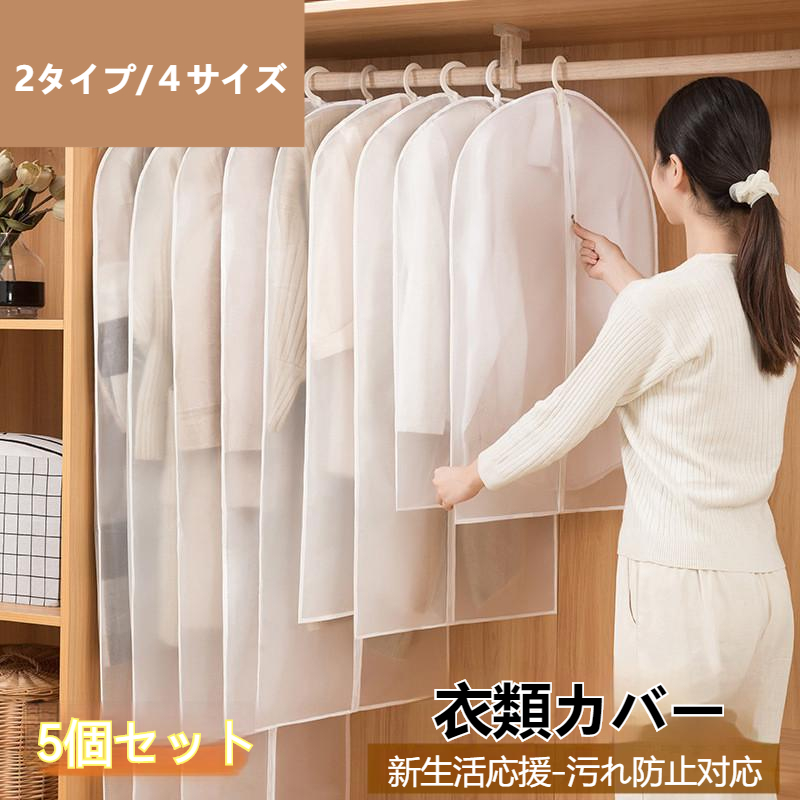 衣類カバー 5枚組 服収納 繰り返す使用可能 衣類収納袋 服カバー 洋服カバー ダストカバー半透明 衣類収納ケース 防虫 2スタイル 4サイズ対応 防塵 防湿 半透明カバー ロング 衣類長期