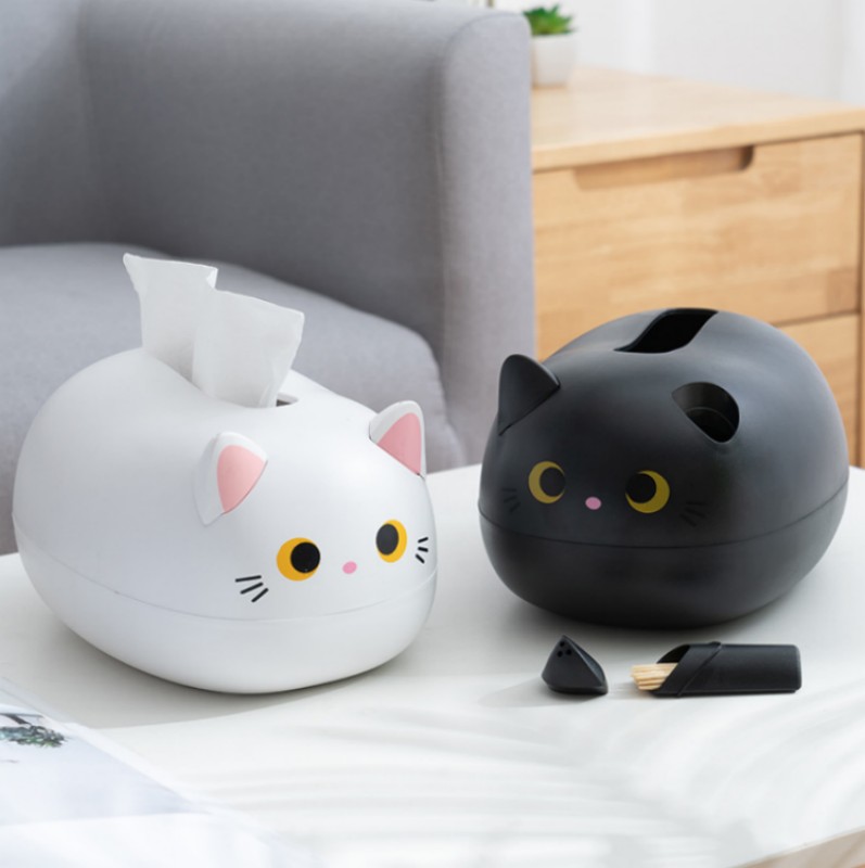 ティッシュケース ブラック ホワイト ネコ 猫 可愛い オシャレ リビング 寝室 テーブル 事務室 リモコンラック ティッシュボックス ティッシュ 楊枝入れ付き --12621-