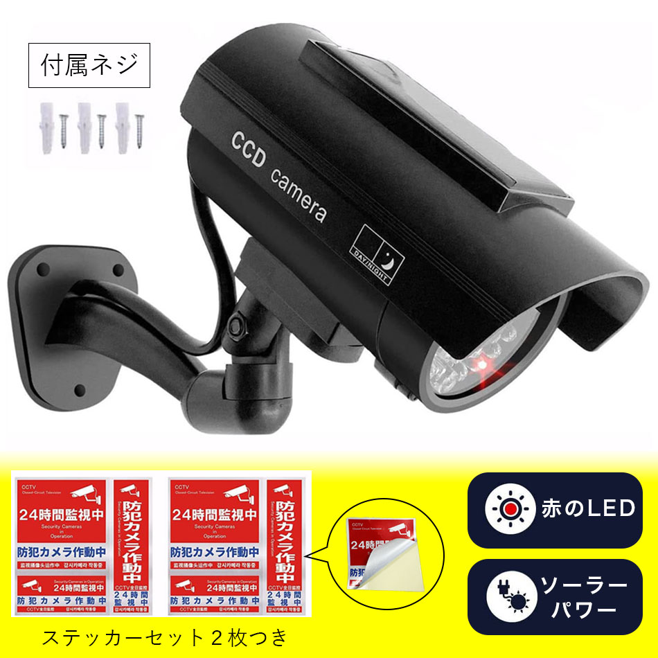 ダミーカメラ ソーラーパネル搭載 防犯カメラ 赤LED常時点滅 防水 屋内外両用監視カメラ不審者を追い出す 防犯カメラ 防犯ステッカー 2式 防犯ステッカー 防犯シール