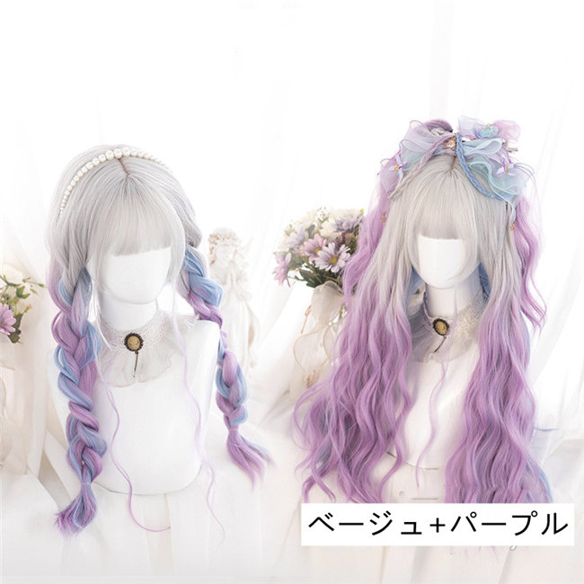 ベージュ+パープル62cm長髪 ロング ロリータ 原宿風 巻き毛 ぱっつん前髪 可愛い ロング 耐熱ウィッグ コスチューム 仮装 自然 ナチュラル イベント 文化祭 普段使いかつらレディースウィッグア