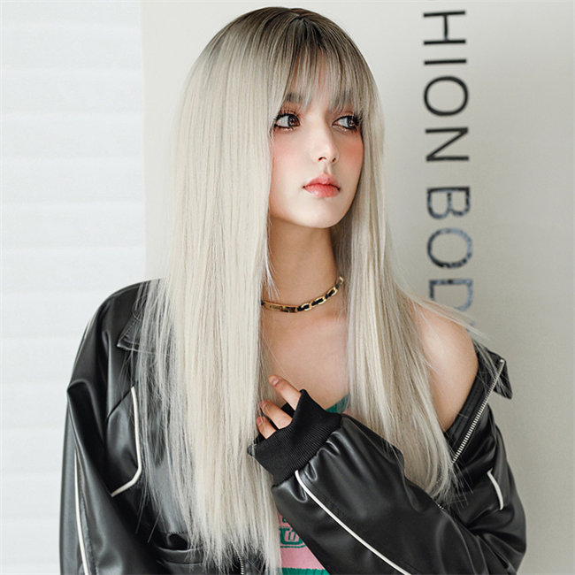 ブラックシャンパン62cm長髪 ロング ロリータ 原宿風 つけ毛 ストレートぱっつん前髪 可愛い ロング 耐熱ウィッグ コスチューム 仮装 自然 ナチュラル イベント 文化祭 普段使いかつらレディース