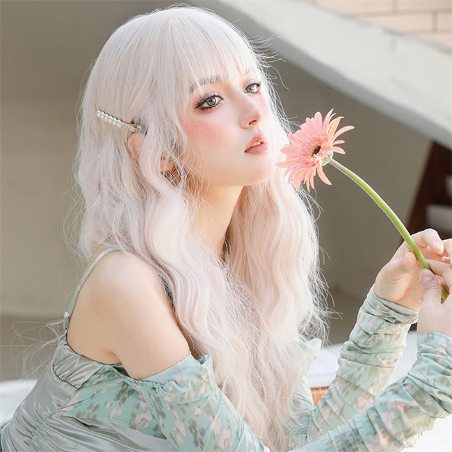 ピンクシルバー67長髪 ロング ロリータ 原宿風 巻き毛 ぱっつん前髪 可愛い ロング 耐熱ウィッグ コスチューム 仮装 自然 ナチュラル イベント 文化祭 普段使いかつらレディースウィッグアッシ