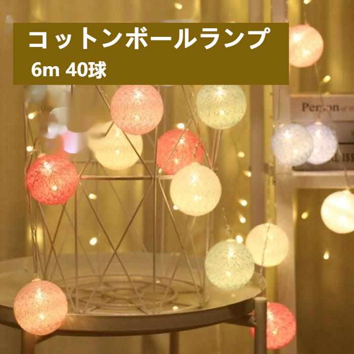 コットンボールランプ 6m 40球 カラフルボールライト イルミネーションライト LEDライト フロアライト 間接照明 ガーランド インテリア照明 電池式 USB式 店舗装飾 子供部屋 室内用 パーテ