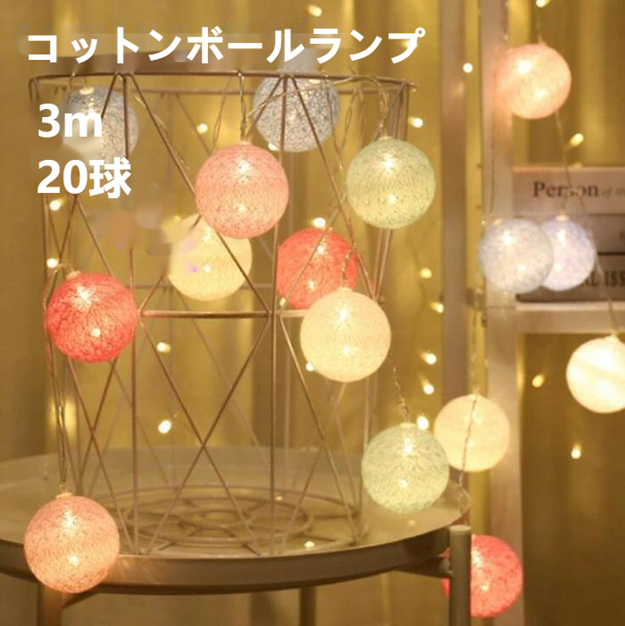 コットンボールランプ 間接照明 ガーランド 3 20球 イルミネーションライト ライト フロアライト カラフルボールライト インテリア照明 電池式 式 店舗装飾 子供部屋 室内用 パーテ