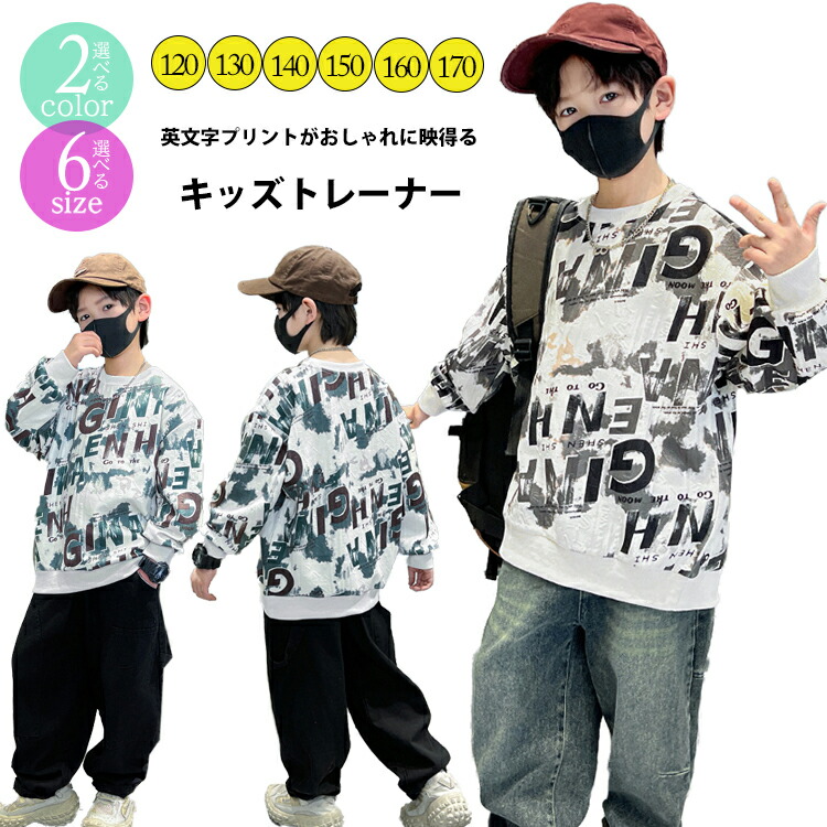 2カラー 6サイズ キッズトップス キッズ プリントトレーナー 英文字 インク風 秋冬 トップス キッズトレーナー プリント トレーナー 長袖 プリント文字 袖口 リブ ラウンドネック