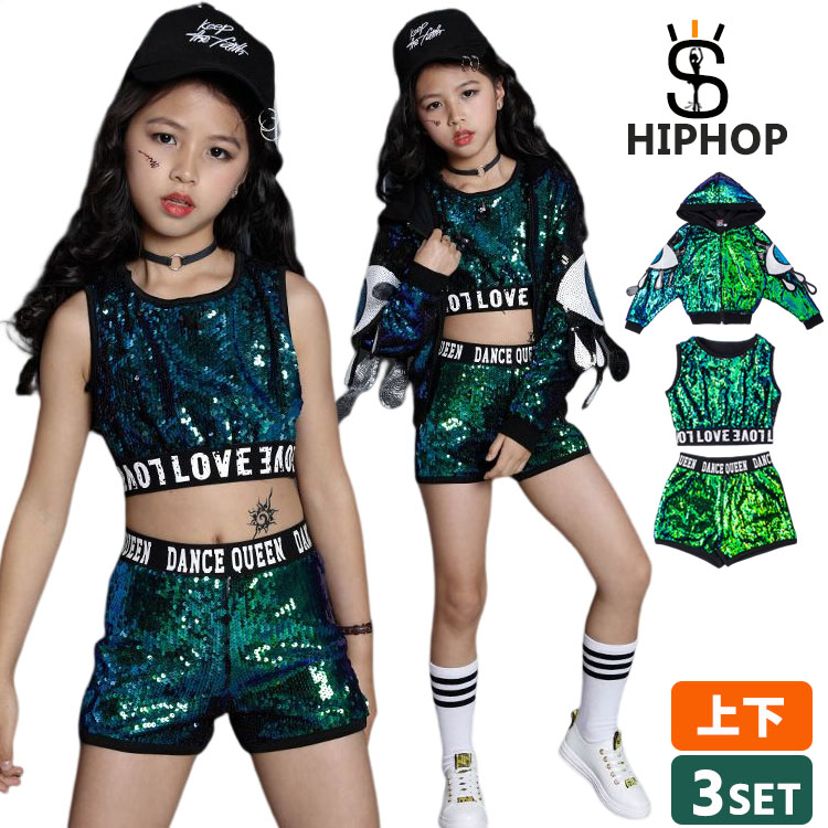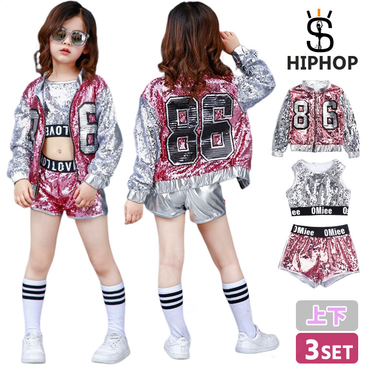 大量注文 3点セット スパンコール ダンス衣装 ダンス 衣装 キッズ ジャケット ヒップホップ セットアップ スパンコール ダンス衣装