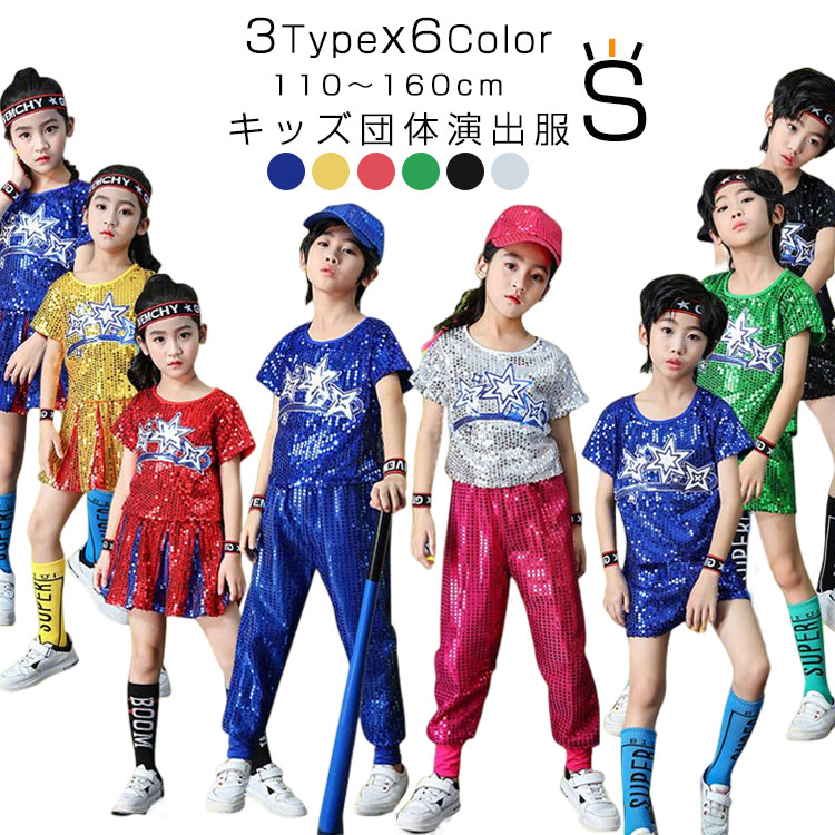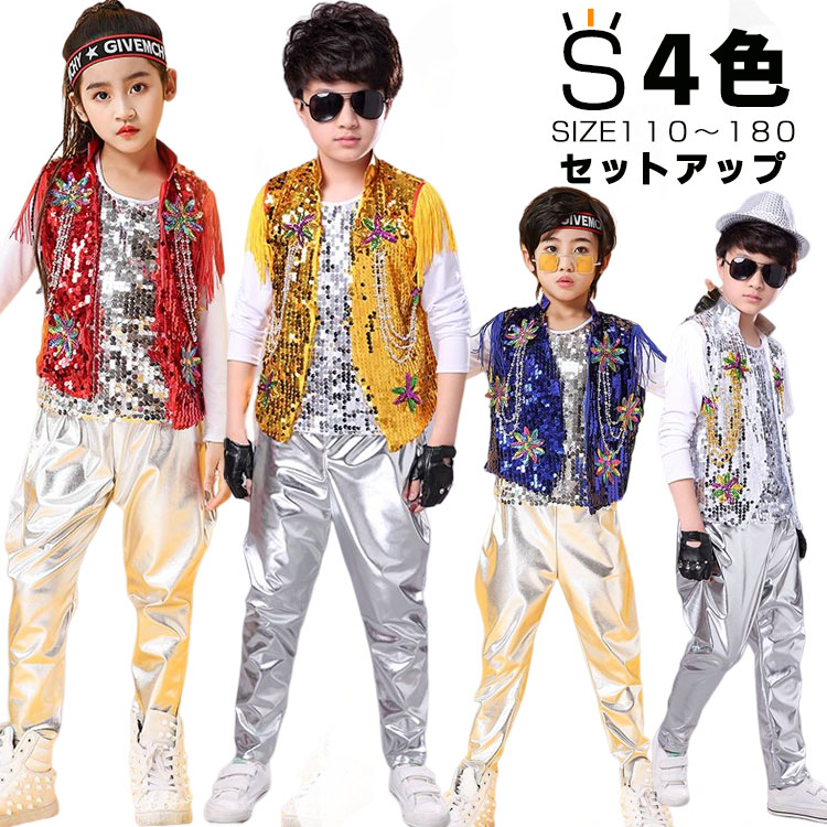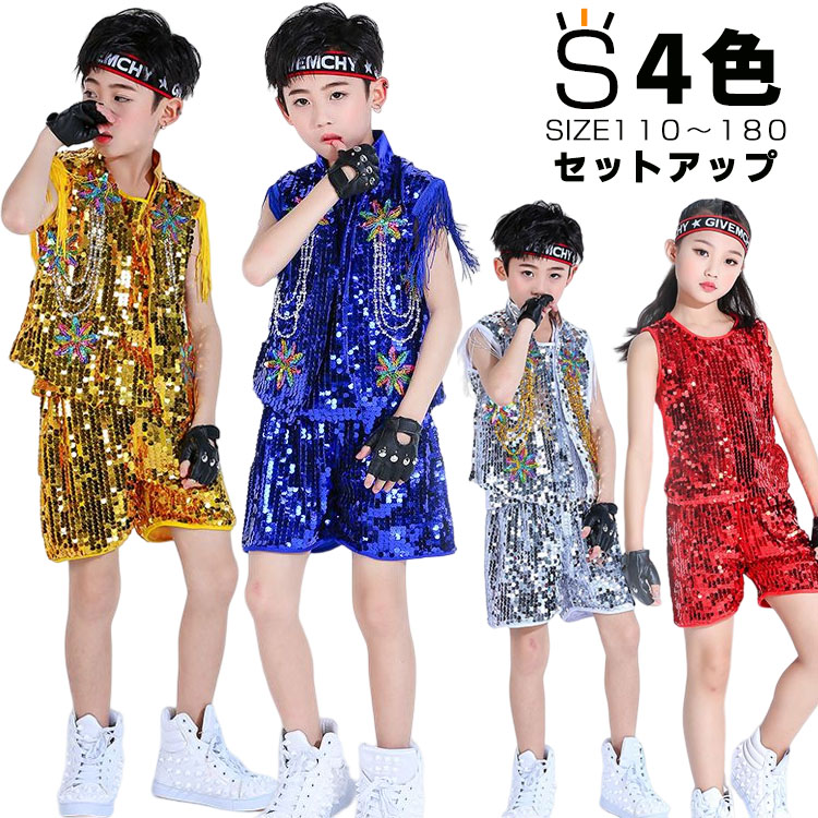 大量注文 スパンコール ダンス衣装 ダンス 衣装 キッズ ベスト ヒップホップ セットアップ スパンコール ダンス衣装 赤 レッド ブルー シルバー ゴールド 豪華3点セット