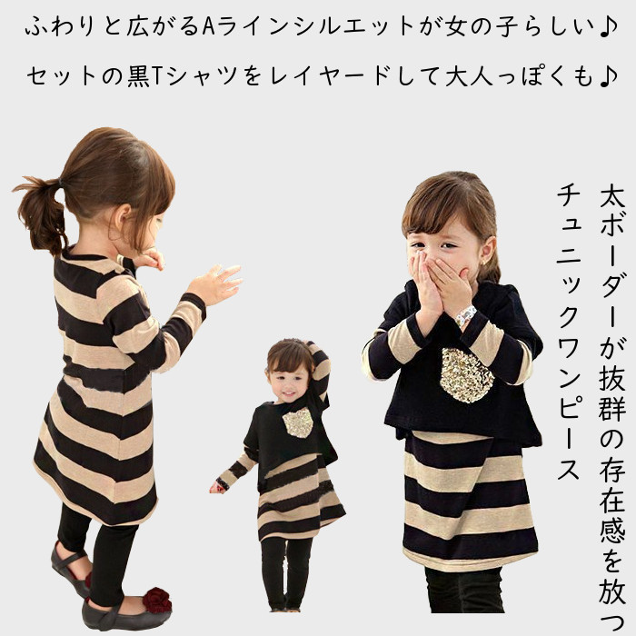 2点セット:キラキラ♪スパンコールポケット&長袖ボーダーチュニックキッズ ベビー マタニティ キッズファッション ワンピース