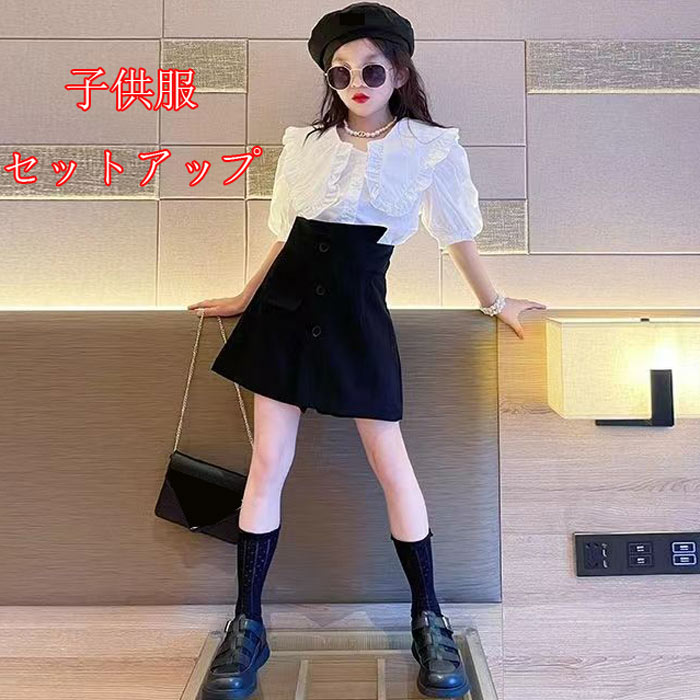 韓国子供服 上下セット 女の子 半袖 シフォン シャツ +スカート おしゃれ 2点セット 90 100 110 120 130