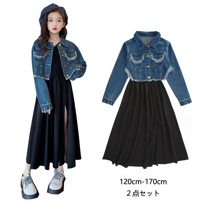 春秋服 女の子 お姫様 上下セット トップスデニムアウター + 長袖ワンピース 2点セットキッズ ベビー マタニティ キッズファッション スーツ カジュアルセットアップ カジュアルスカートセット