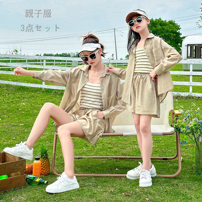 親子服 レディース長袖アウター カット パーカー キッズ 女の子 夏 カット アウターシャツ ショートパンツ3点セット