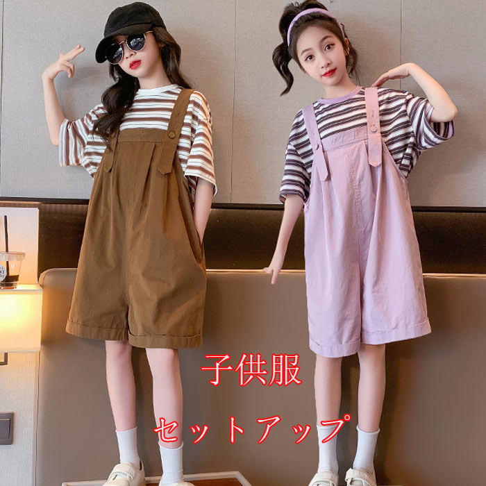 キッズ セットアップ 120 130 140 150 160 170cm子供服 セットアップ 女の子 キッズ ボーダー柄 Tシャツ + ストラップスカート 2点セット