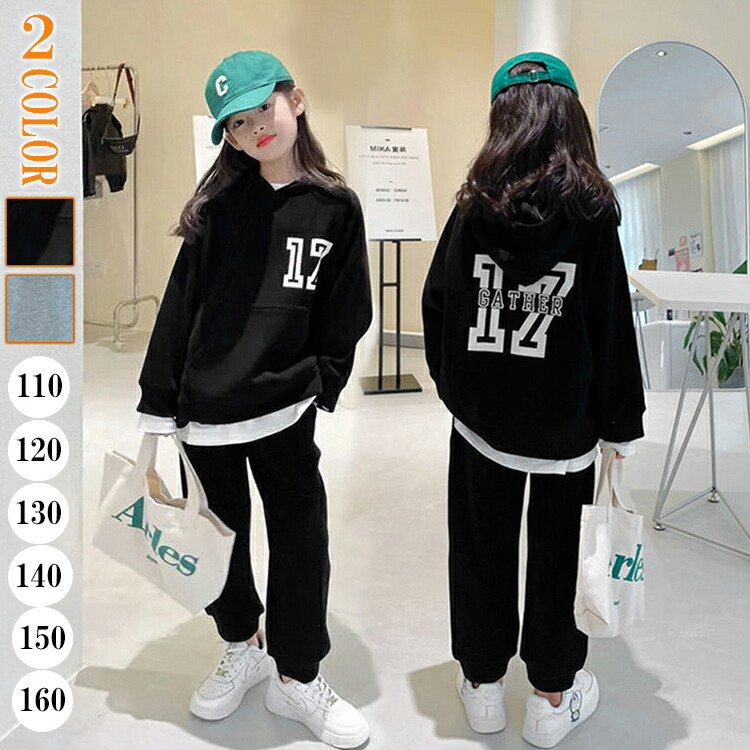 2カラー 6サイズ キッズセットアップ 2点セット フード付き パーカー 秋冬 プリントロゴ 袖口リブ 長袖 長ズボン ポケット付き 上下セット 普段着 練習着 レッスン着 男の子 女の子