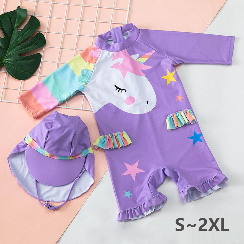 子供水着 キッズ 子供 オールインワン 水着 女の子 ジュニア ラッシュガード 水着 日焼け対策 キッズ みずぎ ベビー水着 ガールズ ワンピース キャップ付き ユニコーン 子供 子ども用 水着 スク