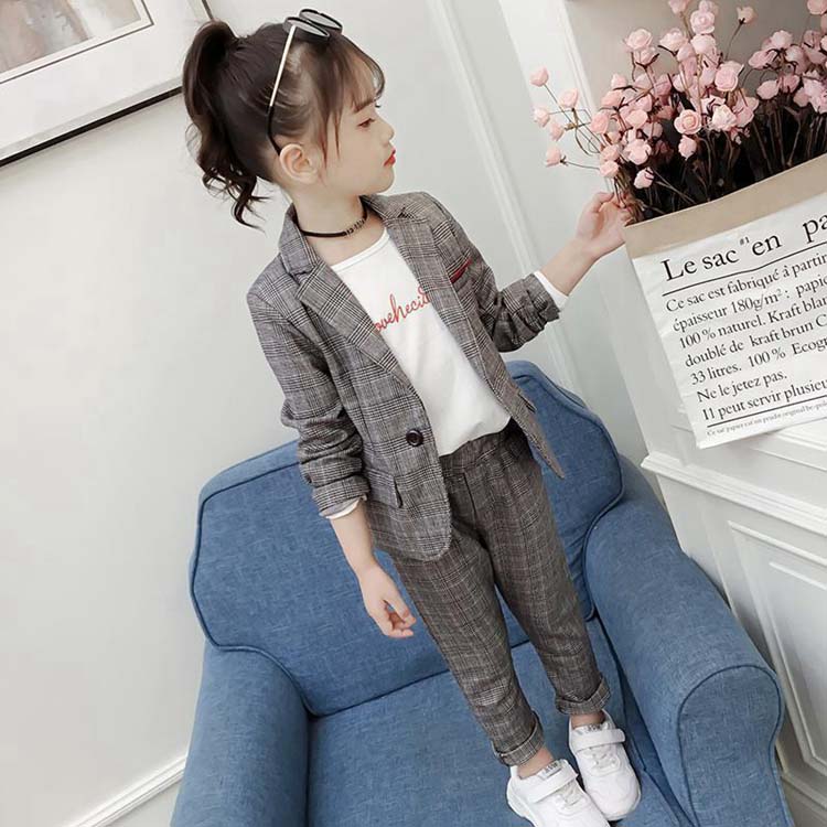 子供スーツ スーツセット スーツジャケット ロング丈パンツ パンツスーツ チェック柄 上下 2点セット 子供服 女の子 フォーマル カジュアル 長袖 コート 長ズボン 通学 通勤
