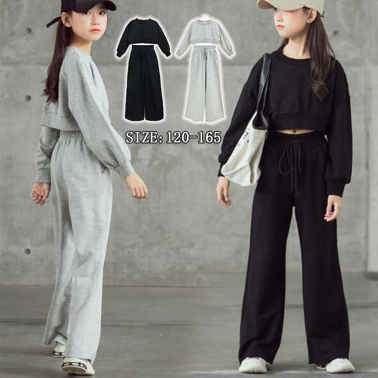 セットアップ レディース キッズ 女の子 大きいサイズ カジュアル おしゃれ オフィス ショートスウェット へそ出し 長ズボン 黒 上下 2点セット フォーマル ダンス衣装
