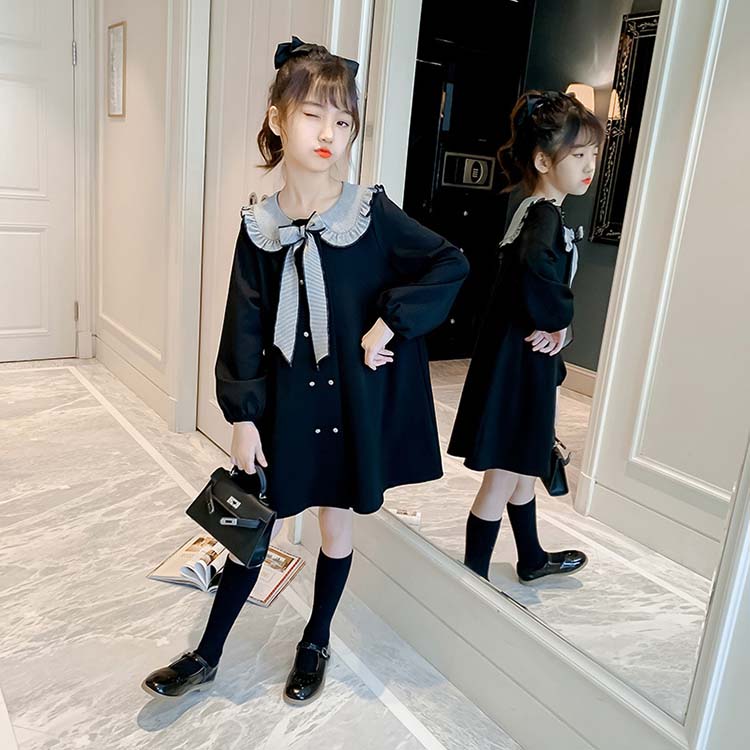 子供服 オールインワン ワンピース キッズ 長袖 セーラーカラー 黒 丸襟 無地 子供 ジュニア ワンピース リボン 春秋 大人らし 韓国風 仕事 通勤 通学 宴会 パーディー