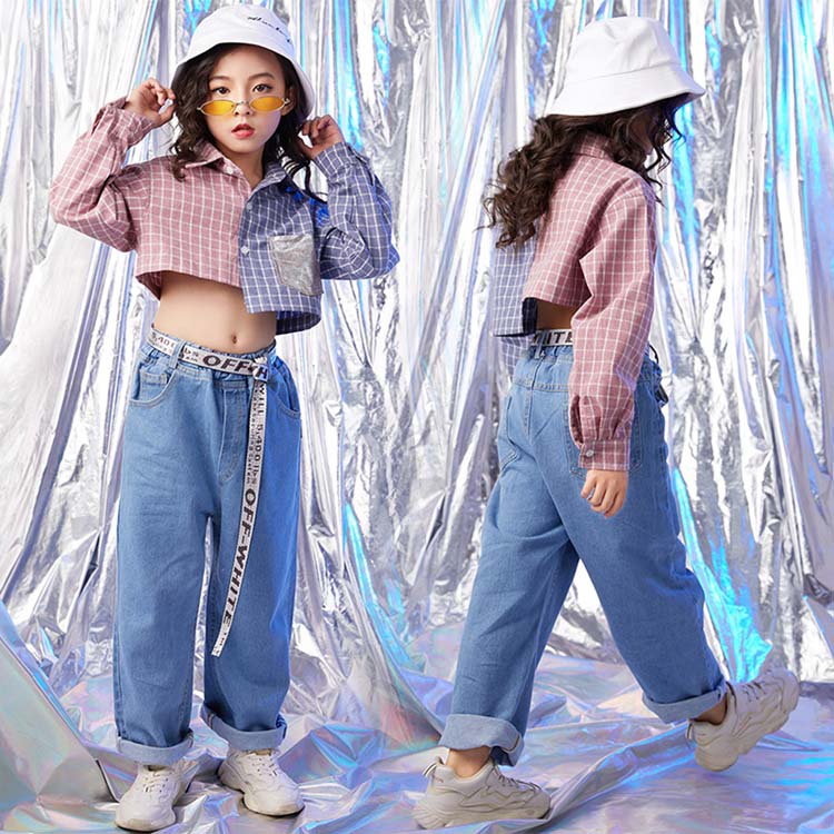 ヒップホップ 衣装 ファッション ダンス衣装 キッズ 長袖 シャツ 混色 チェック柄 ジーンズ おしゃれ デニム ロング丈 パンツ 長ズボン ダンスウェア レディース