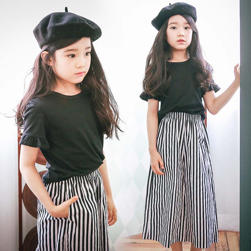子供服 子ども服 女の子 夏 夏服 セットアップ カジュアル ナチュラル 半袖 Tシャツ フリルデザイン ゴムバンド ワイドパンツ 七分丈 ストライプ柄 カットソー
