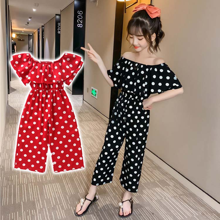セットアップ レディース キッズ カジュアル 夏 大きいサイズ 半袖 おしゃれ オフィス オールインワン 服 半袖 ドット柄 水玉柄 ボートネック 肩出し ロング丈