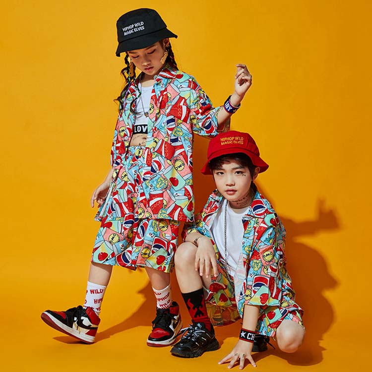 ヒップホップ 衣装 ファッション 半袖 シャツ 短パン 五分丈 飲料柄 キッズダンス衣装 ダンス衣装 キッズ ダンスウェア おしゃれ キッズ ストリート 子供服 ヒップホップ衣装