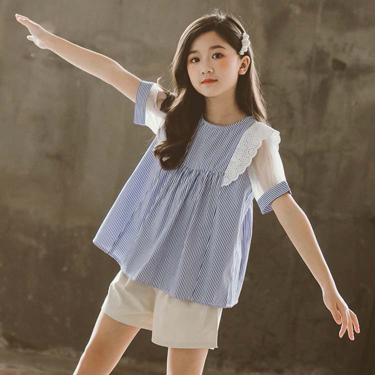 子供服 子ども服 女の子 夏 夏服 セットアップ カジュアル ナチュラル 半袖 ブラウス 後ろボタン 短パン 可愛い かわいい ストライプ柄 ゆったり ショートパンツ