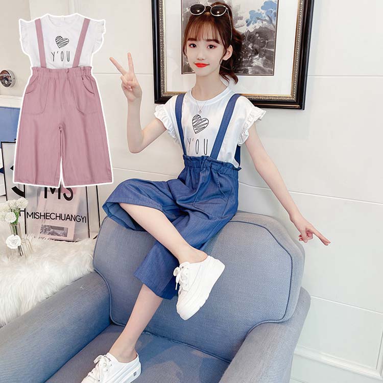 子供服 子ども服 女の子 夏 夏服 セットアップ カジュアル ナチュラル 半袖 Tシャツ フリルデザイン オーバーオール 七分丈 ワイドパンツ 上下 2点セット
