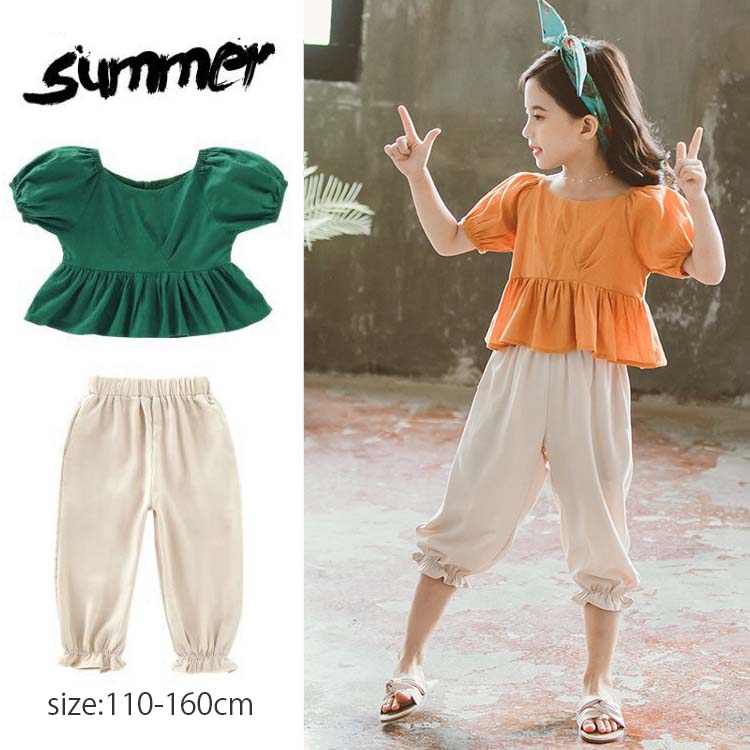 セットアップ レディース キッズ 女の子 カジュアル 夏 韓国 大きいサイズ おしゃれ 半袖 ブラウス パフ袖 フリル 七分丈 ズボン サルエルパンツ 2点セット 夏服 可愛い