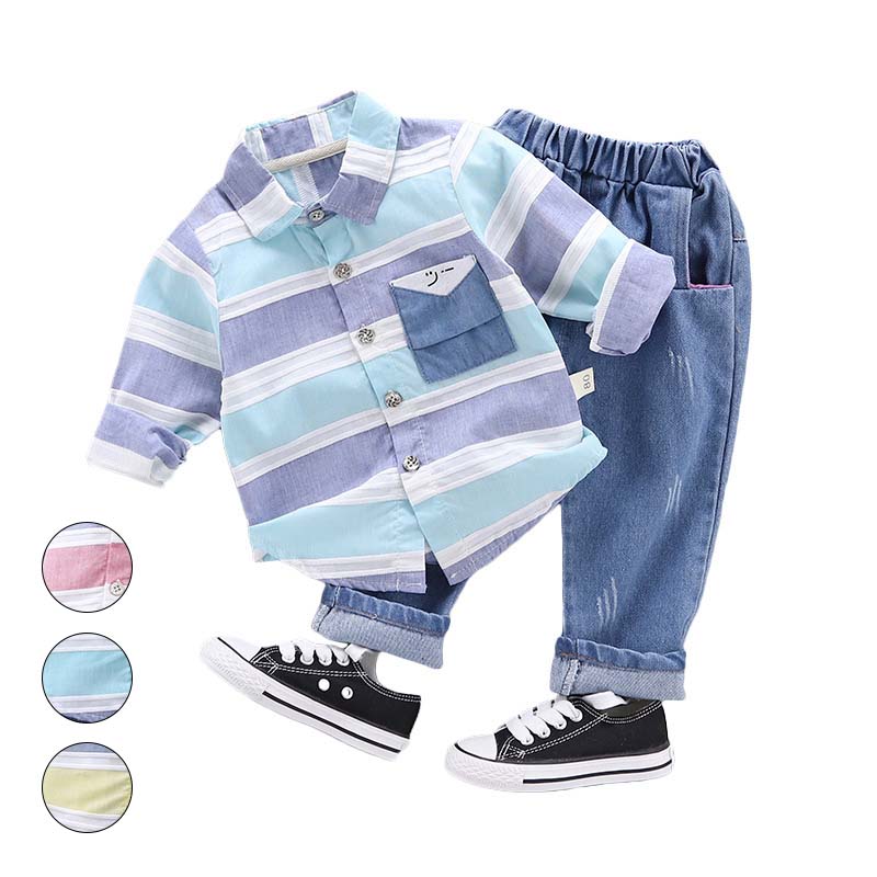 ベビー服 男の子 新生児 80 90 長袖 シャツ 折り襟 ストライプ柄 ジーンズ 子ども服 子供服 男の子 セットアップ デニム ロング丈 ズボン ゴムバンド 日常 普段着 通園