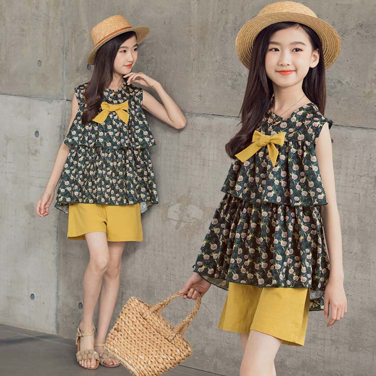 子供服 子ども服 女の子 夏 夏服 カジュアル ナチュラル ブラウス ノースリーブ 袖なし 花柄 総柄 リボン飾り 短パン ショートパンツ 半ズボン 上下 2点セット 可愛い 海