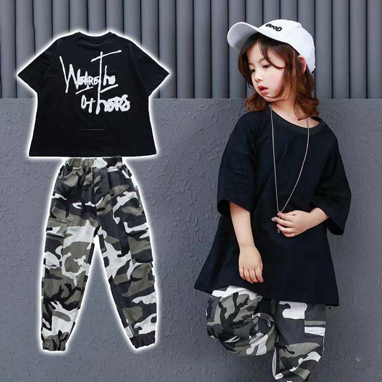 ヒップホップ 衣装 ファッション 半袖 Tシャツ 後ろ文字柄 長ズボン 迷彩 サルエルパンツ ダンス衣装 キッズ 男の子 女の子 ダンスウェア jazz HIPHOP 普段着 通学